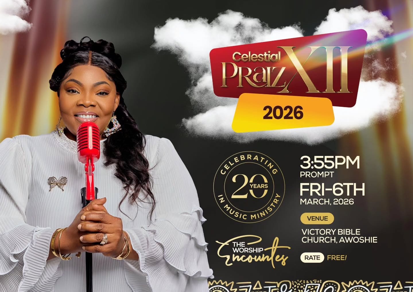 Dubbed Celestial Praiz XII, the worship gathering is scheduled for Friday, March 6, 2026, at Victory Bible Church, Awoshie, with a 3:55 PM prompt. The event is free and open to the public, inviting worshippers to come together for an intense moment of praise and thanksgiving.