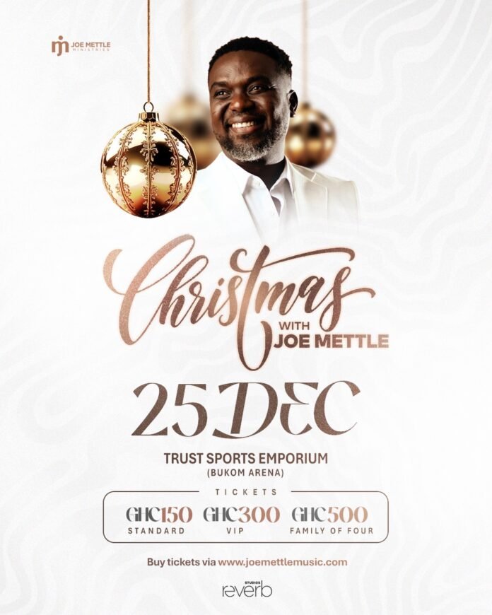 Ghana’s award-winning gospel icon Joe Mettle has officially announced the 2025 edition of his annual holiday concert, “Christmas With Joe Mettle.” The event is set for 25th December at the Trust Sports Emporium (Bukom Arena), promising a warm, joy-filled Christmas Day celebration for families, worshippers, and music lovers.